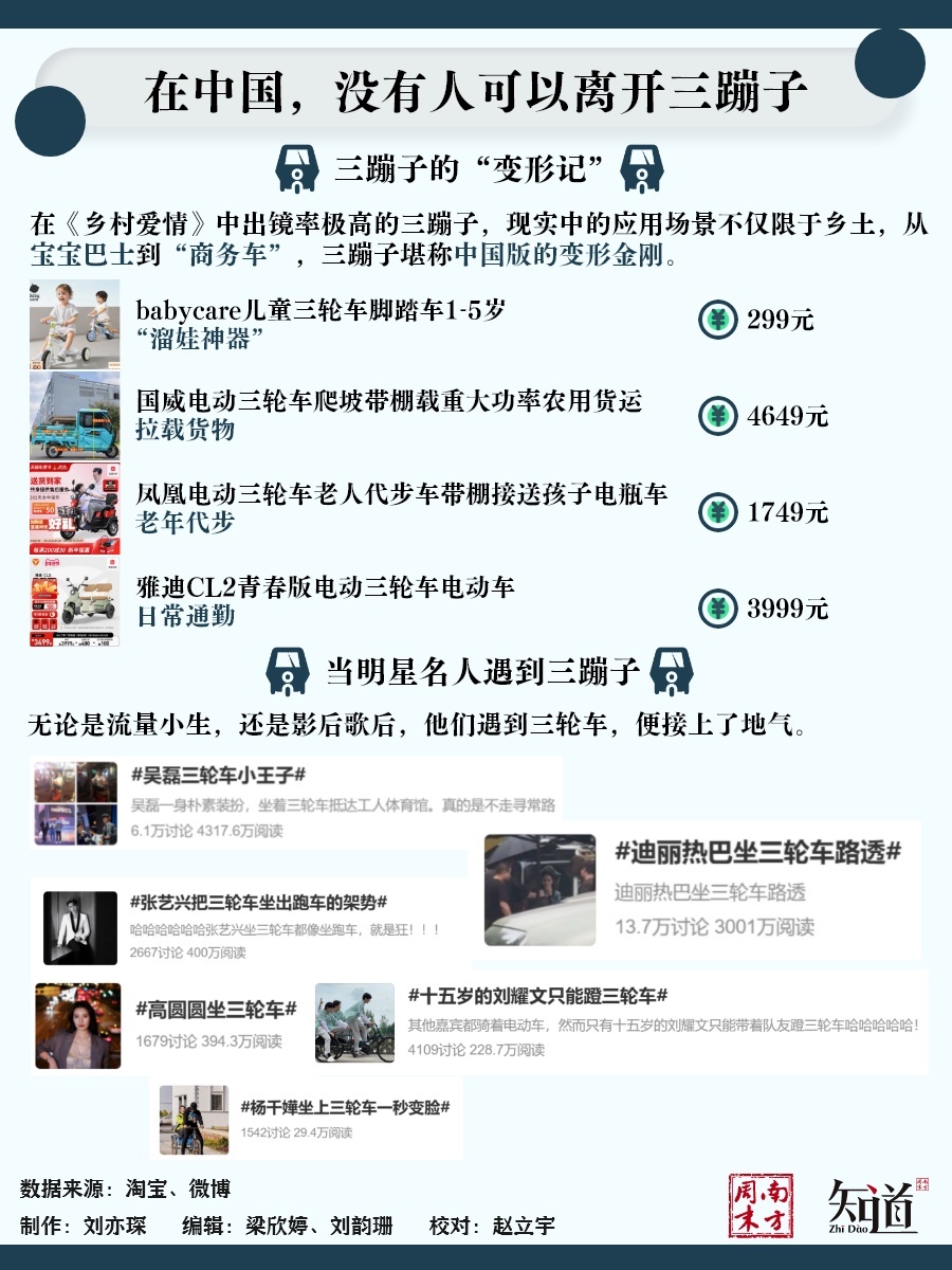无论是流量小生,还是影后歌后,都难以拒绝一辆可以在繁密路网中自由平稳穿行的三蹦子。微博话题“吴磊三轮车小王子”获得了超4000万阅读量,“迪丽热巴坐三轮车路透”也有超过3000万的阅读量。