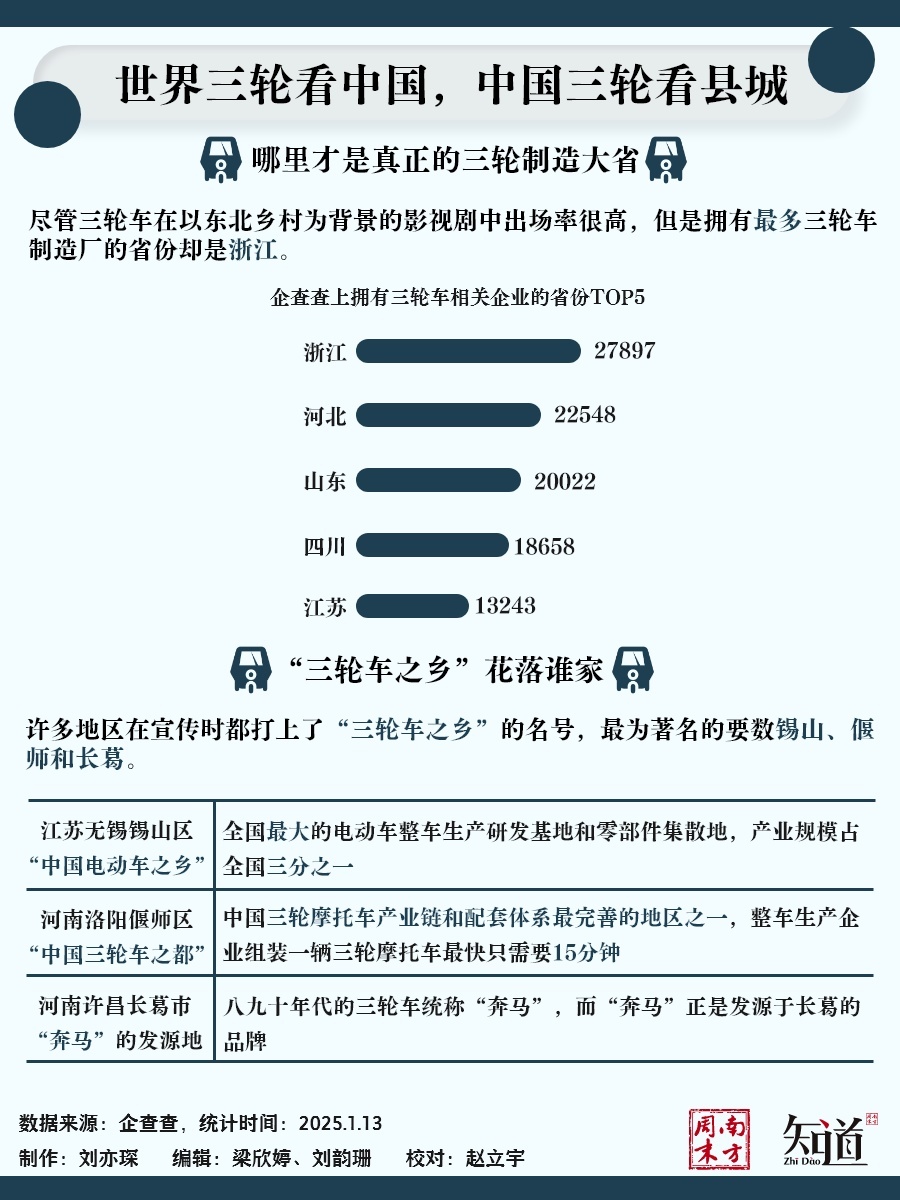 世界三轮看中国,中国三轮看县城。尽管三轮车在以东北乡村为背景的影视剧中出场率很高,但浙江却以27000余家的数量成为拥有最多三轮车相关企业的省份。其次是河北、山东,而东三省甚至无缘前五。